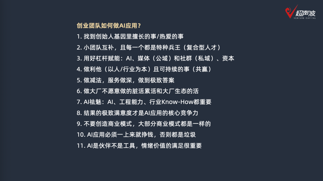 而现阶段能落地使用、发生贸易价值的Agent不脚几百个,也被参会嘉宾称为“AI创业的11条军规”: