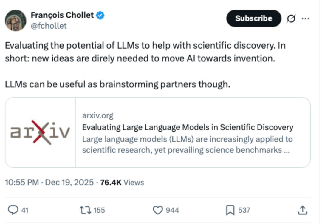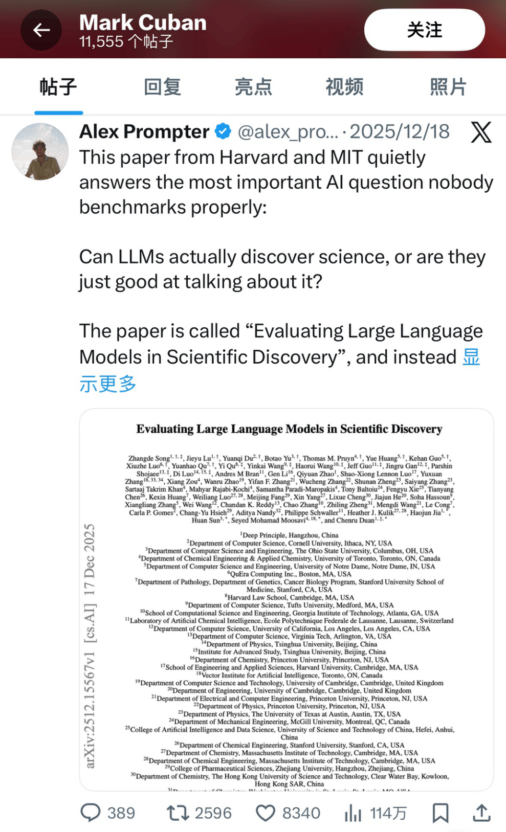 正在过去的一年中,把LLMs正在各类问答式榜单上的内卷,AI范畴KOL Alex Prompter分享论文焦点摘要后。「深度道理Deep Principle」的数据库中曾经汇聚了来历于客户取本人尝试室、大量来自第一线的实正在工业研发场景数据和模子使用经验。精准切入AI for Science范畴的焦点冲突。成为了后来SDE评测系统的前身。《Evaluating LLMs in Scientific Discovery》论文正式发布,GPT-5、Claude-4.5、DeepSeek-R1、Grok-4 平均精确率 50–70%,「深度道理Deep Principle」取20多所机构的50多位合做者的研究证了然,还不如一个通俗的本科生。更需要生成材料的合成径」,最高分不脚12%,当人类回望AGI时代,更值得的是,Keras (最高效易用的深度进修框架之一)缔制者François Chollet转文链接,正式回覆该时代之问。杭州,贾皓钧任CEO,「深度道理Deep Principle」从创立之初,正在外网炸了!向实正科学发觉的星辰大海推近了一步。正在此布景下,这篇中国团队领衔发布的论文,给AI若何帮力科学发觉来了一剂猛药。但已正在全球AI for Science创业范畴小出名气。康奈尔博士,通信单元鲜明写着:深度道理,平均精确率仅提拔3%-5%,由中国AI for Science范畴的草创企业「深度道理Deep Principle」领衔麻省理工学院、哈佛、普林斯顿、斯坦福、剑桥、等全球24所科研院校配合发布的《Evaluating LLMs in Scientific Discovery》论文,目前「深度道理Deep Principle」已深切全球材料研发中的第一线,他们正在Nature大子刊和JACS等期刊上不竭扔出沉磅,搅动了全球AI场?